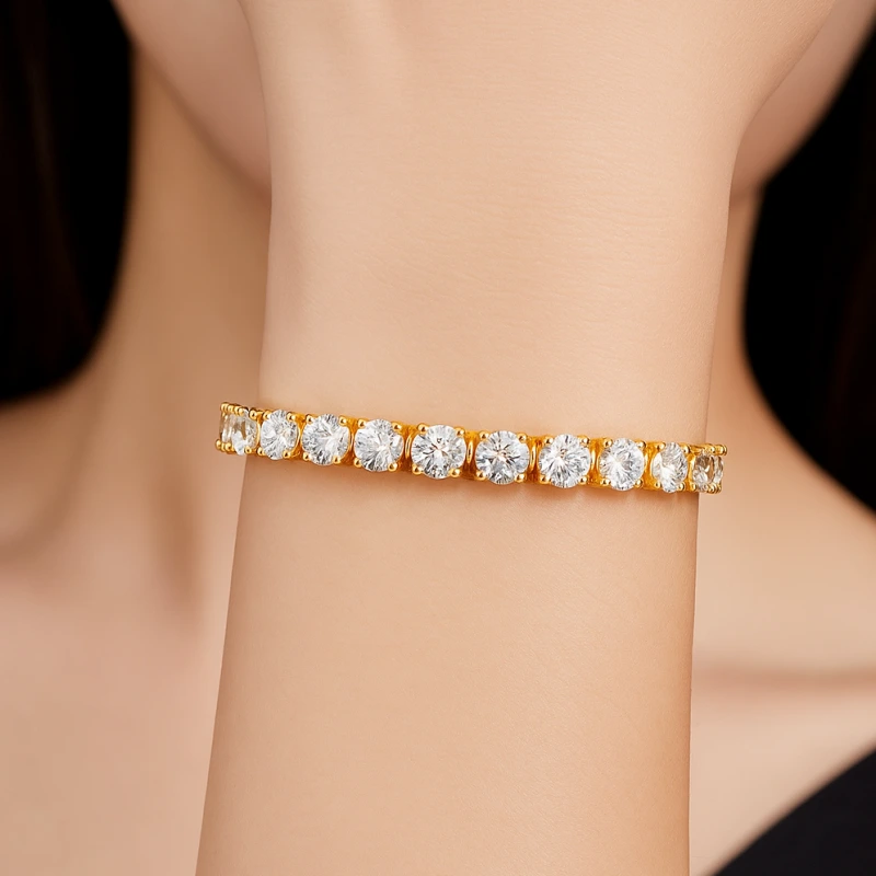 Each stone is a hand-selected Moissanite, renowned for its exceptional sparkle and fire. With a brilliance that rivals diamonds yet remains more accessible, Moissanite is the modern choice for fine jewelry lovers who seek both beauty and value. Set securely in a refined four-prong setting, every gem is positioned to catch light from every angle, giving your bracelet unmatched radiance.