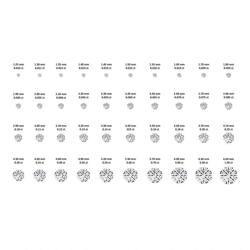 Carat Sizes Available: 0.1 | 0.2 | 0.3 | 0.4 | 0.5 | 0.6 | 0.8 | 1 | 1.2 | 1.5 | 2 | 2.5 | 3 | 3.5 carat (custom sizes available)