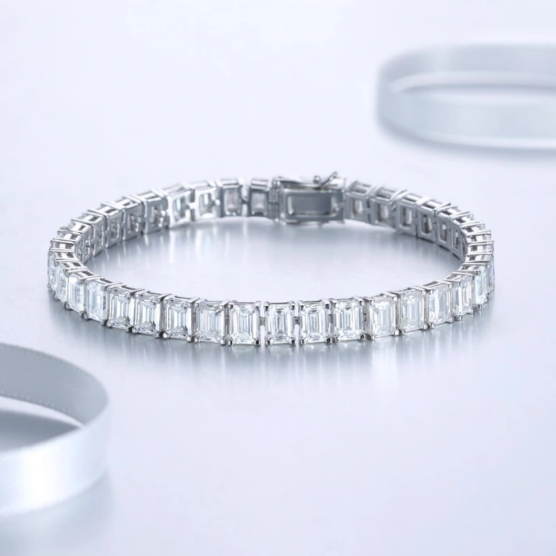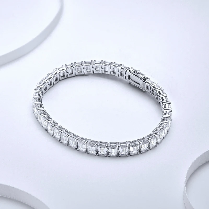 Each 4×5.5mm emerald cut Moissanite is meticulously selected for its exceptional fire and clarity, offering a high-end look that’s indistinguishable from a diamond at a more accessible price point. The bracelet is crafted from robust 925 sterling silver and generously plated with 18K gold, ensuring a luxurious finish that is both durable and tarnish-resistant.