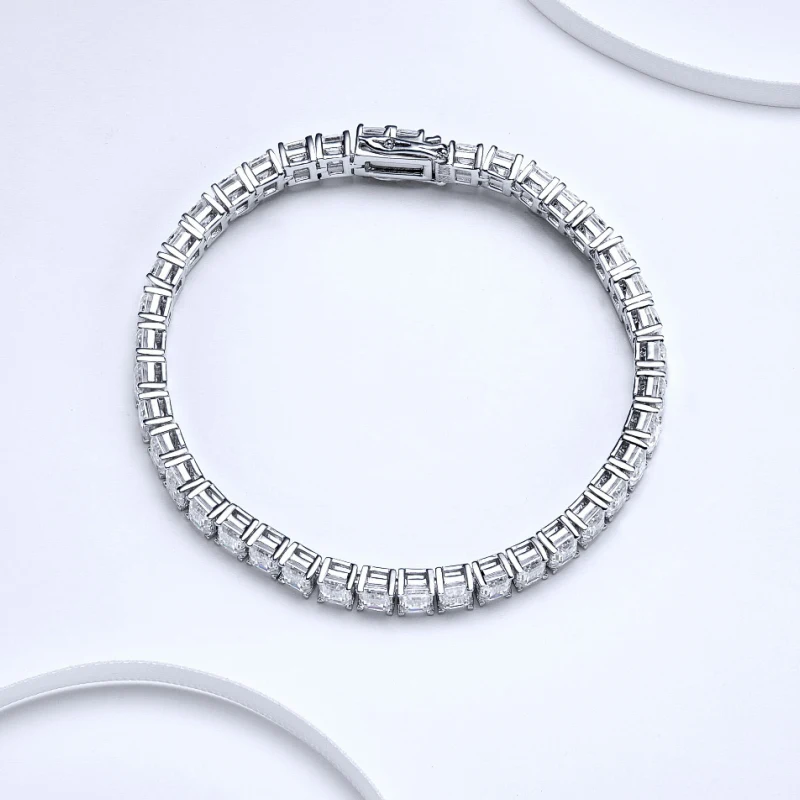 This isn’t just a men’s tennis bracelet—it’s a statement of power and sophistication. Our unique design moves beyond the traditional round cut, featuring striking emerald cut Moissanite stones that deliver a bold, masculine brilliance. The clean, straight lines of the emerald cut create a commanding presence on the wrist, perfect for the modern gentleman who appreciates both style and substance.