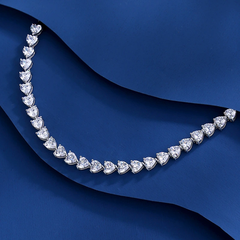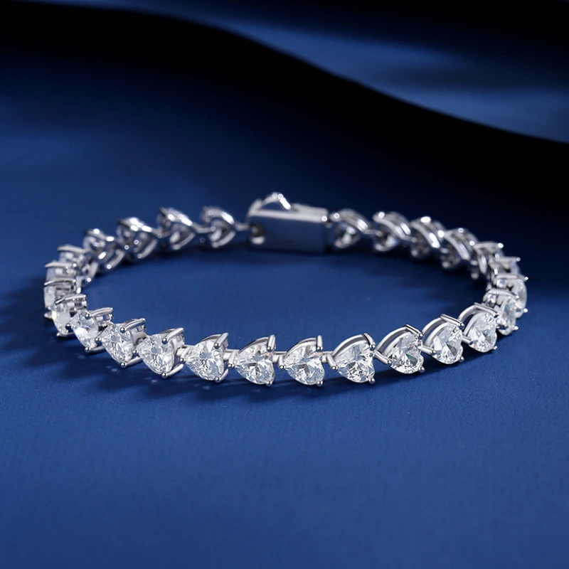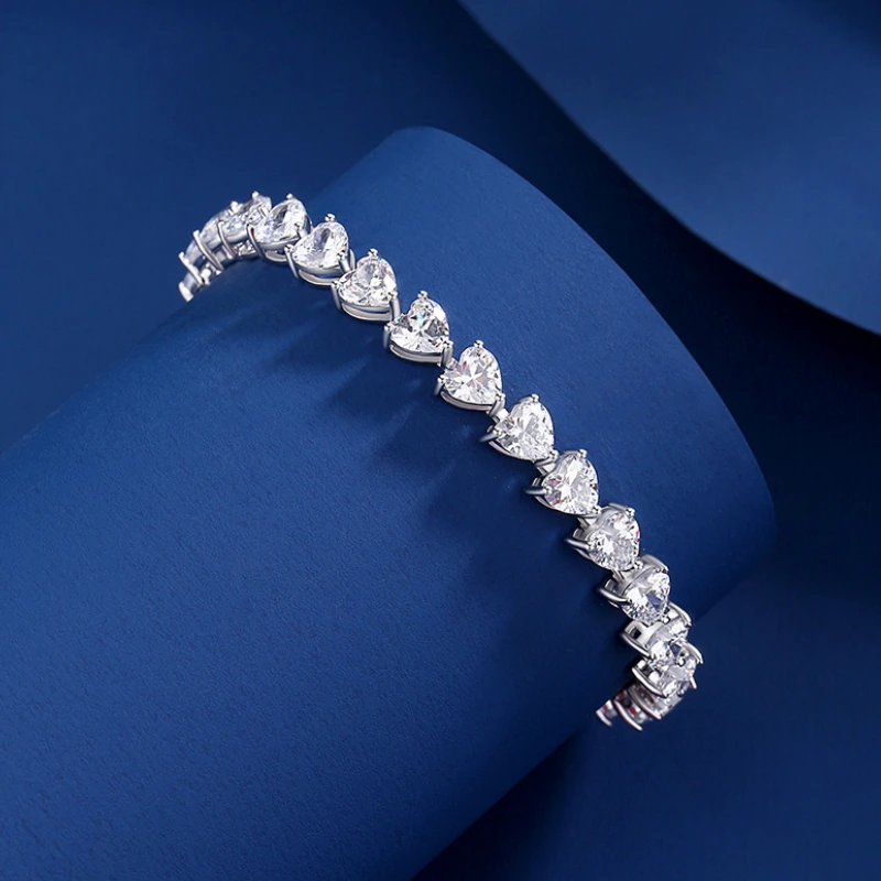 Each heart-shaped stone is a premium-grade cubic zirconia (CZ), carefully cut to mirror the brilliance of fine diamonds. Every CZ gem is securely set in a classic four-prong design, maximizing light reflection and creating a continuous stream of sparkle across your wrist.